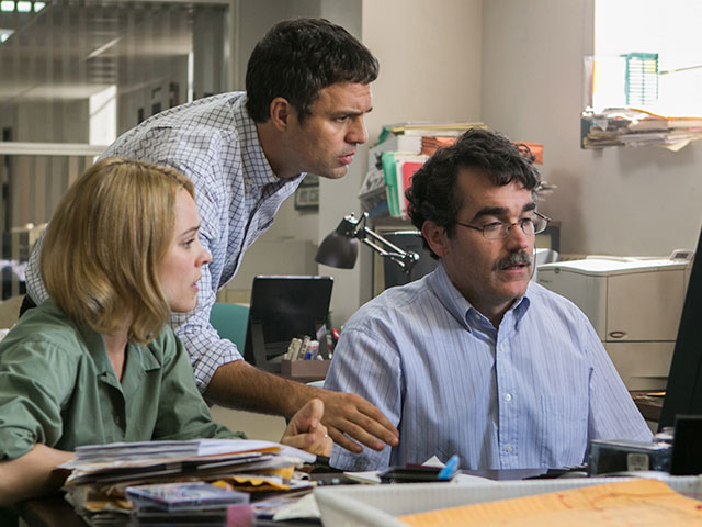 New editor-in-chief Marty Baron (Schreiber) shakes things up at The Boston Globe when he re-assigns the paper's "Spotlight" team to dig up an old story. Led by editor Walter "Robby" Robinson (Keaton), dogged reporters Mike Rezendes (Ruffalo), Sacha Pfeiffer (McAdams), and Matt Carroll (Brian d'Arcy James) uncover a massive child molestation scandal within the city's Catholic Churches.