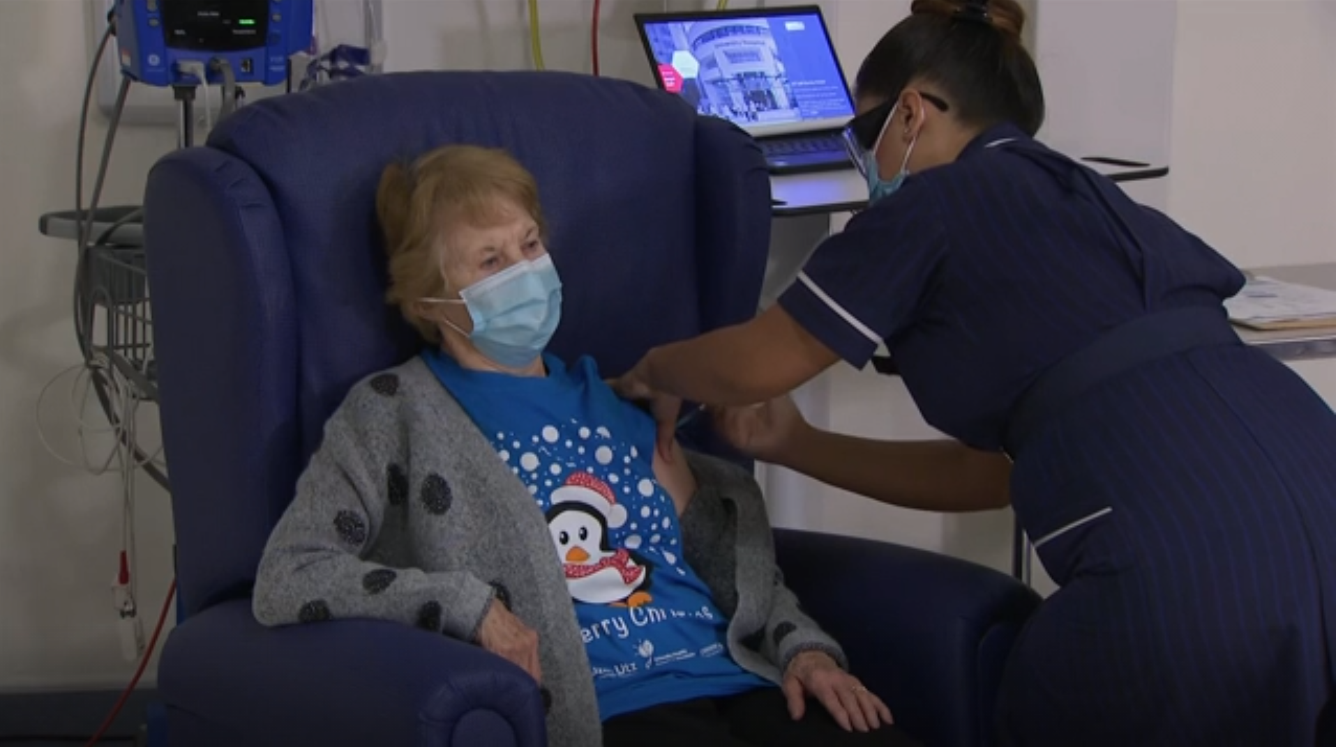 “I feel so privileged to be the first person vaccinated against COVID-19,” said the former jewelry shop assistant, who wore a surgical mask and a blue Merry Christmas T-shirt decorated with a cartoon penguin wearing a Santa hat and red scarf. “It’s the best early birthday present I could wish for because it means I can finally look forward to spending time with my family and friends in the New Year after being on my own for most of the year.”