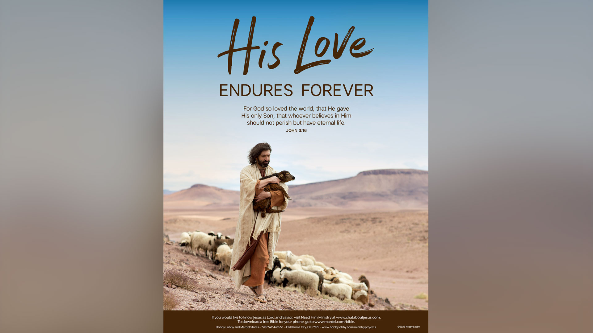This year's full-page ad featured a man depicting Jesus, carrying a sheep across a field. The headline read, "His Love Endures Forever" and the copy quoted the New Testament's