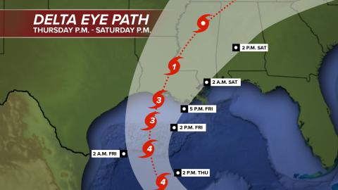 Delta is forecast to take a fairly steady west-northwest path into Thursday. Then, from Thursday to Friday, the hurricane is projected to begin a curved path to the north over the west-central Gulf. As the storm approaches the Louisiana coast late Friday, it may begin to turn more to the northeast.