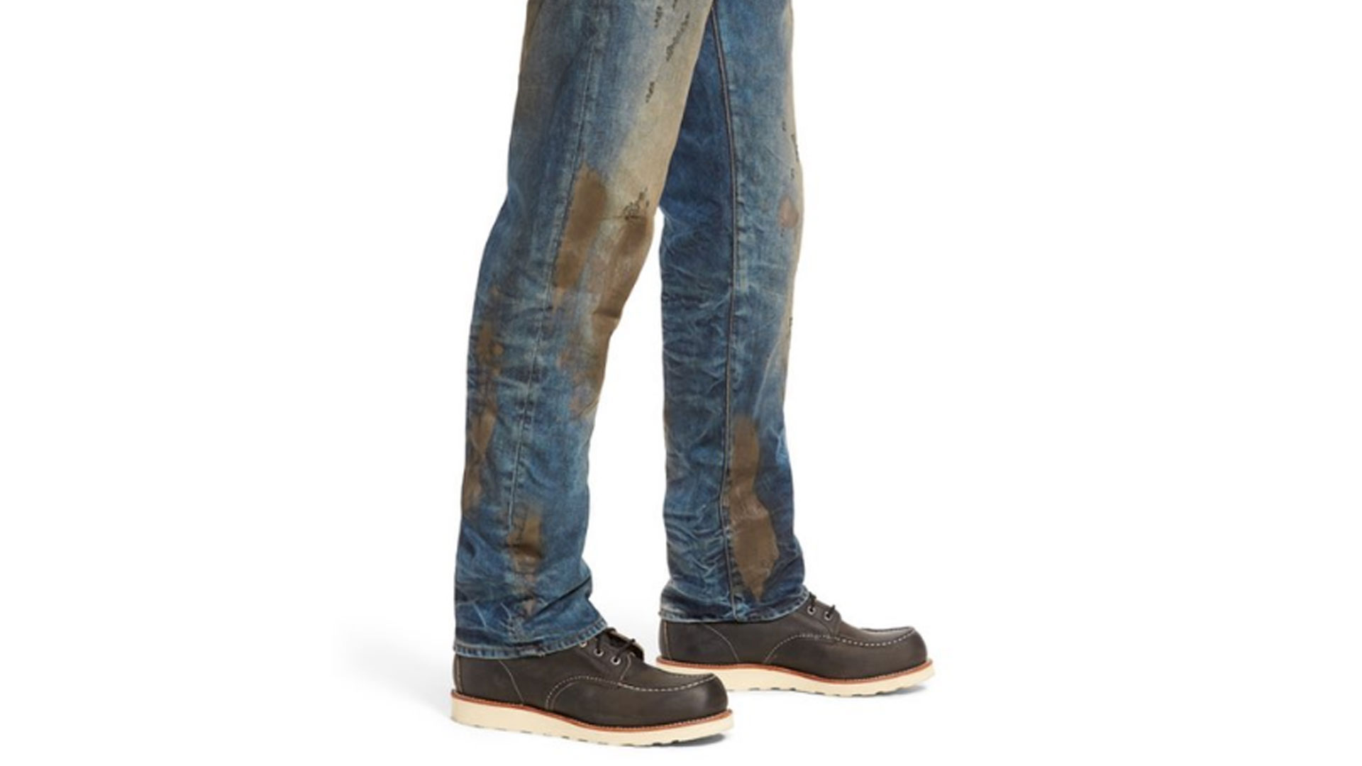 Nordstrom describes them as "Heavily distressed medium-blue denim jeans in a comfortable straight-leg fit embody rugged, Americana workwear that's seen some hard-working action with a crackled, caked-on muddy coating that shows you're not afraid to get down and dirty."